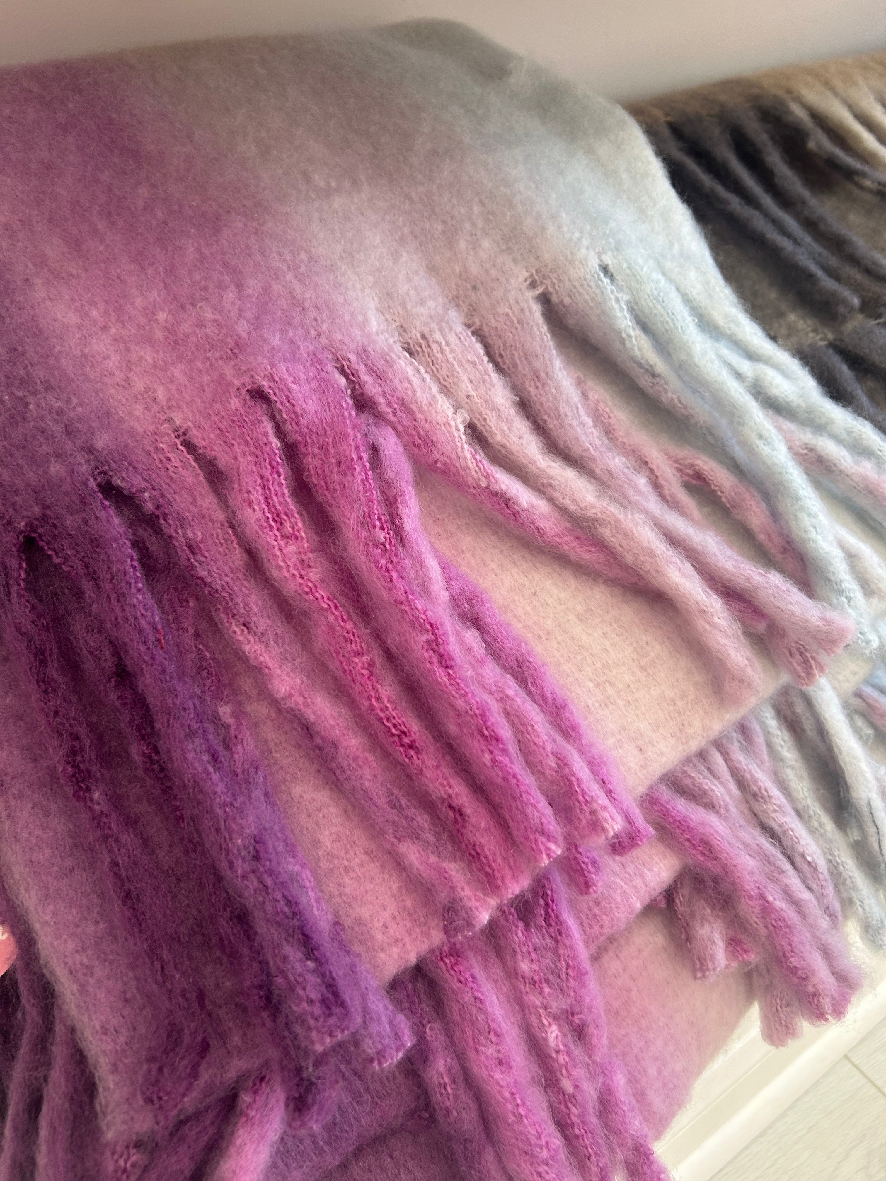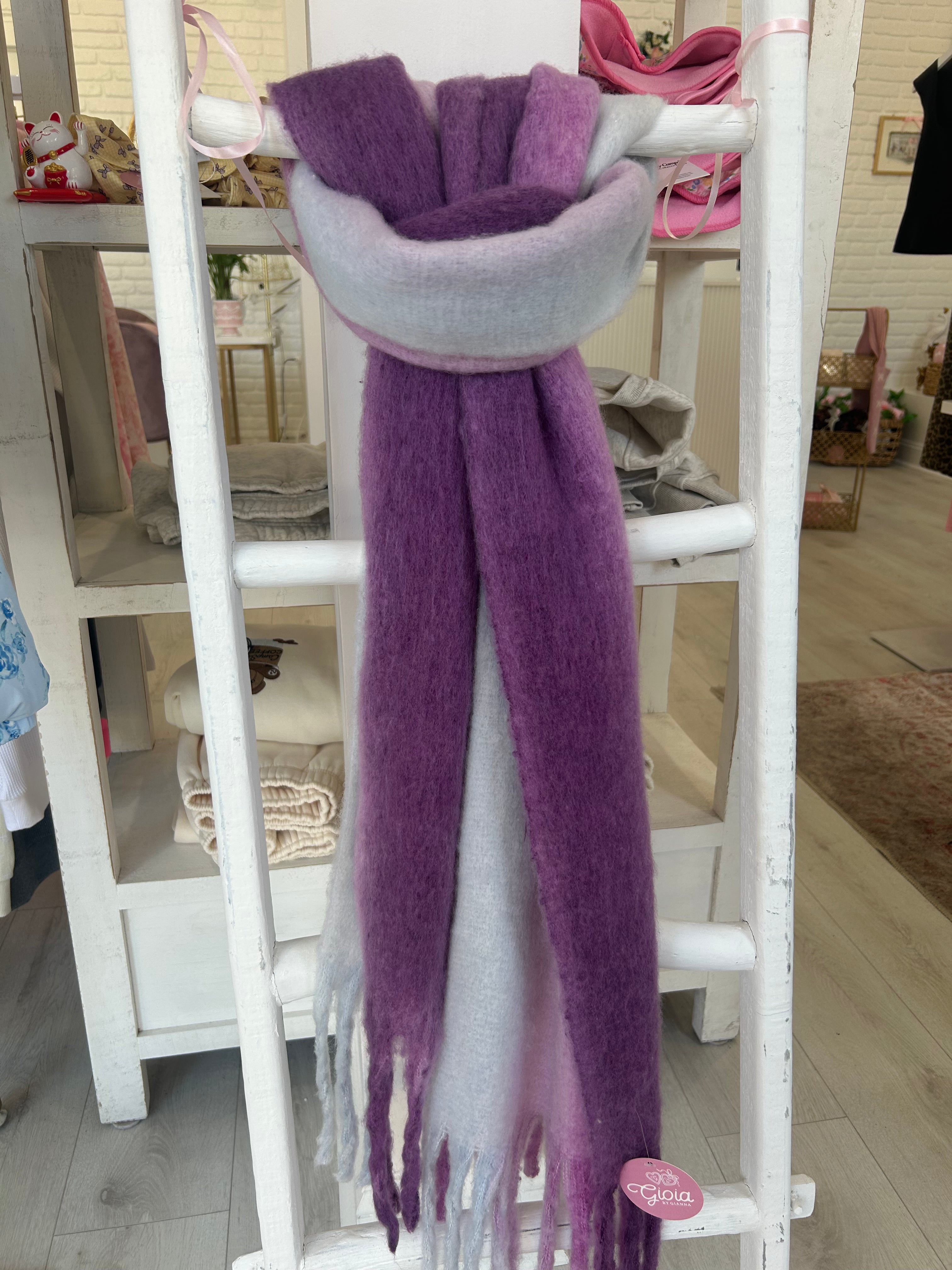 Stay stylish and cozy with our Purple Scarfs featuring a playful ombre pattern in purple and blur. Perfect for adding a pop of color to any outfit and keeping you warm in chilly weather. Embrace your unique style with these quirky scarfs!
