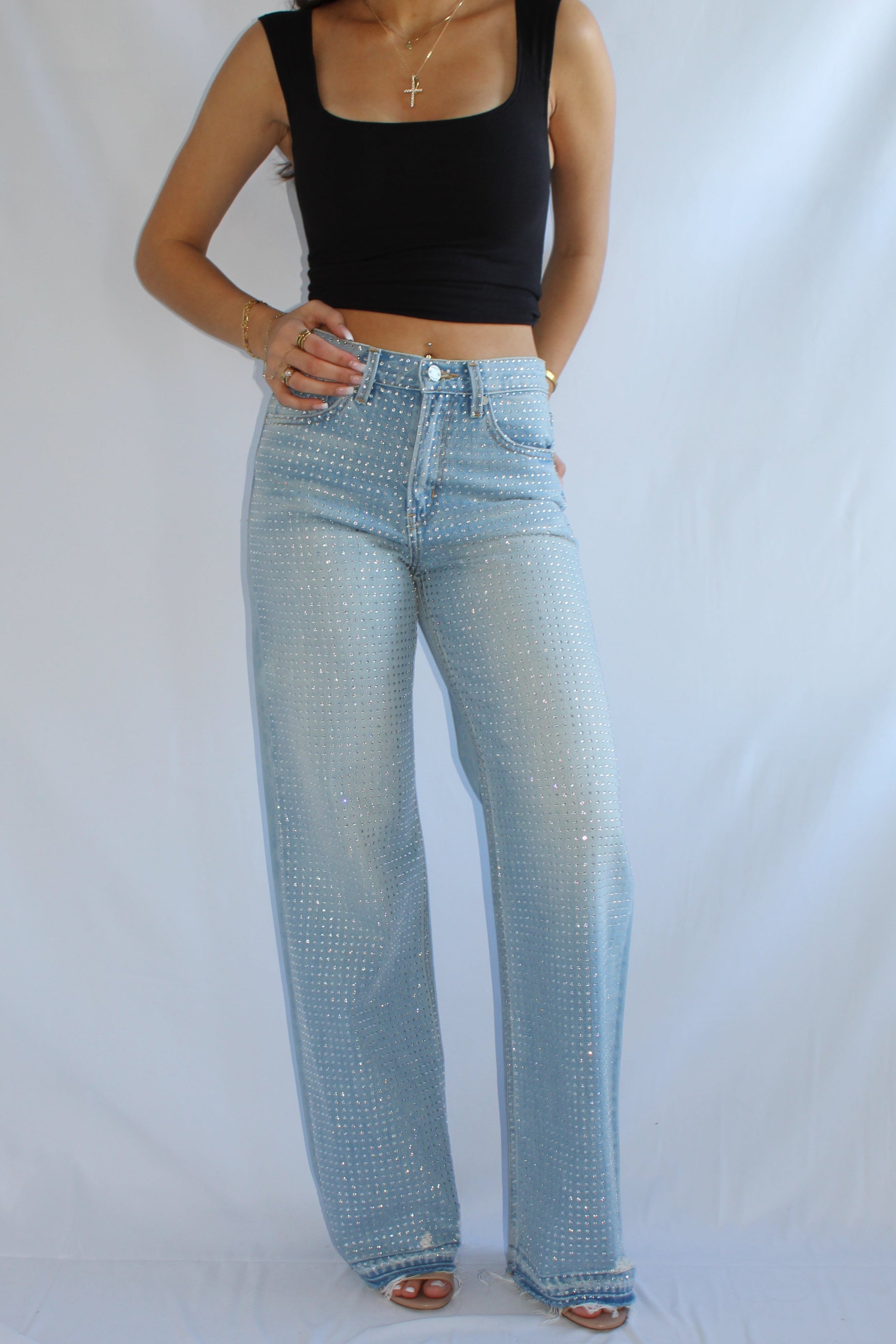 Rock your outfit with The Smith Rhinestone-Embellished Straight Leg jeans. These mid-rise jeans add a touch of sparkle to any occasion. A fun twist on traditional denim, perfect for special occasions.