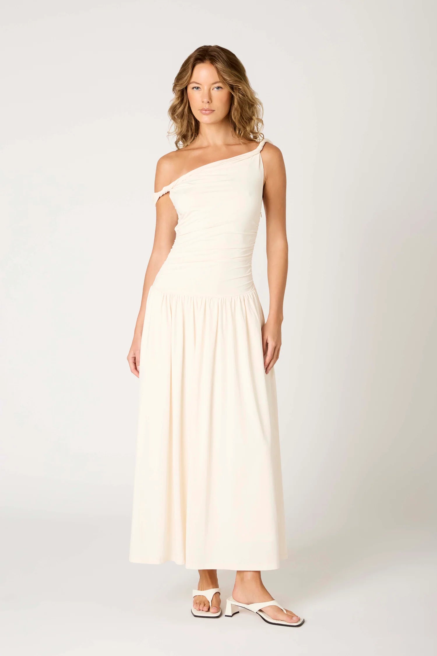 Step out in style with the Karina Dress—a fresh twist on a classic look. Its ruched bodice and chic one-shoulder neckline bring a modern flair, while the drop waist leads into a flowing, full skirt that moves with you. In a timeless neutral shade, this dress is your go-to for turning heads at any special event or a night out that calls for a little extra sparkle.