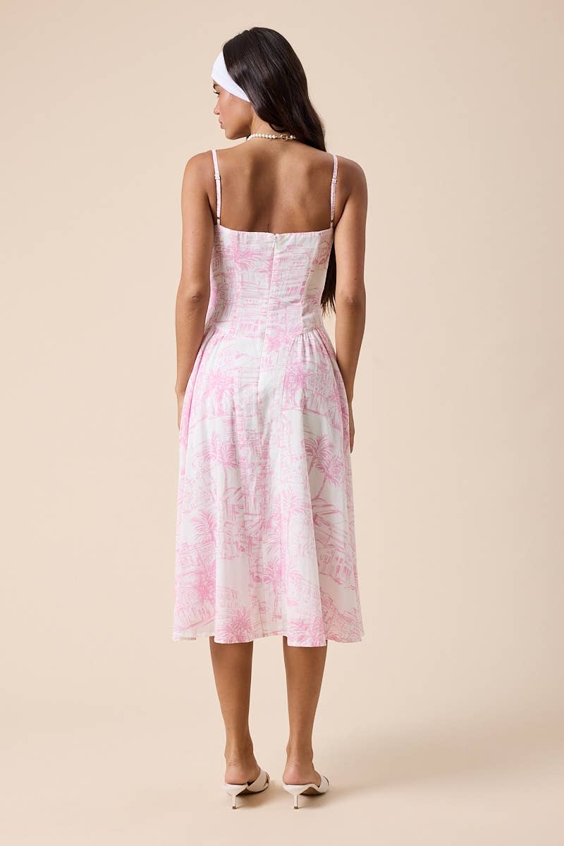 Step into charm with the Ravello Midi Dress, featuring a playful European city graphic print that sparks wanderlust. Its sweetheart neckline and sleeveless design keep things flirty and fresh, while adjustable straps ensure the perfect fit. Practical side pockets add a touch of ease, and the back zipper offers effortless wear. The fit-and-flare silhouette flatters every curve, making this bustier-style midi dress your go-to for sunny days and city adventures.