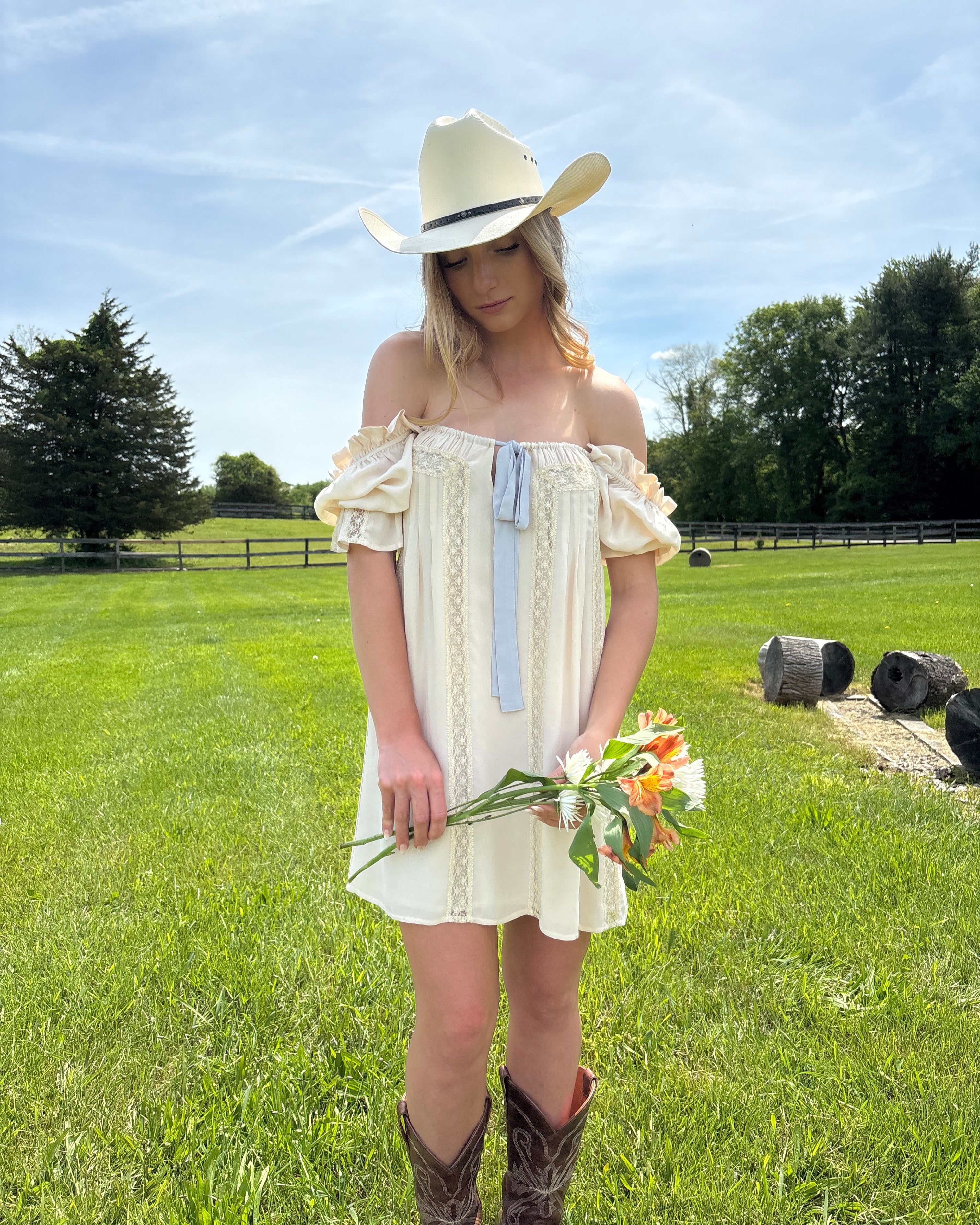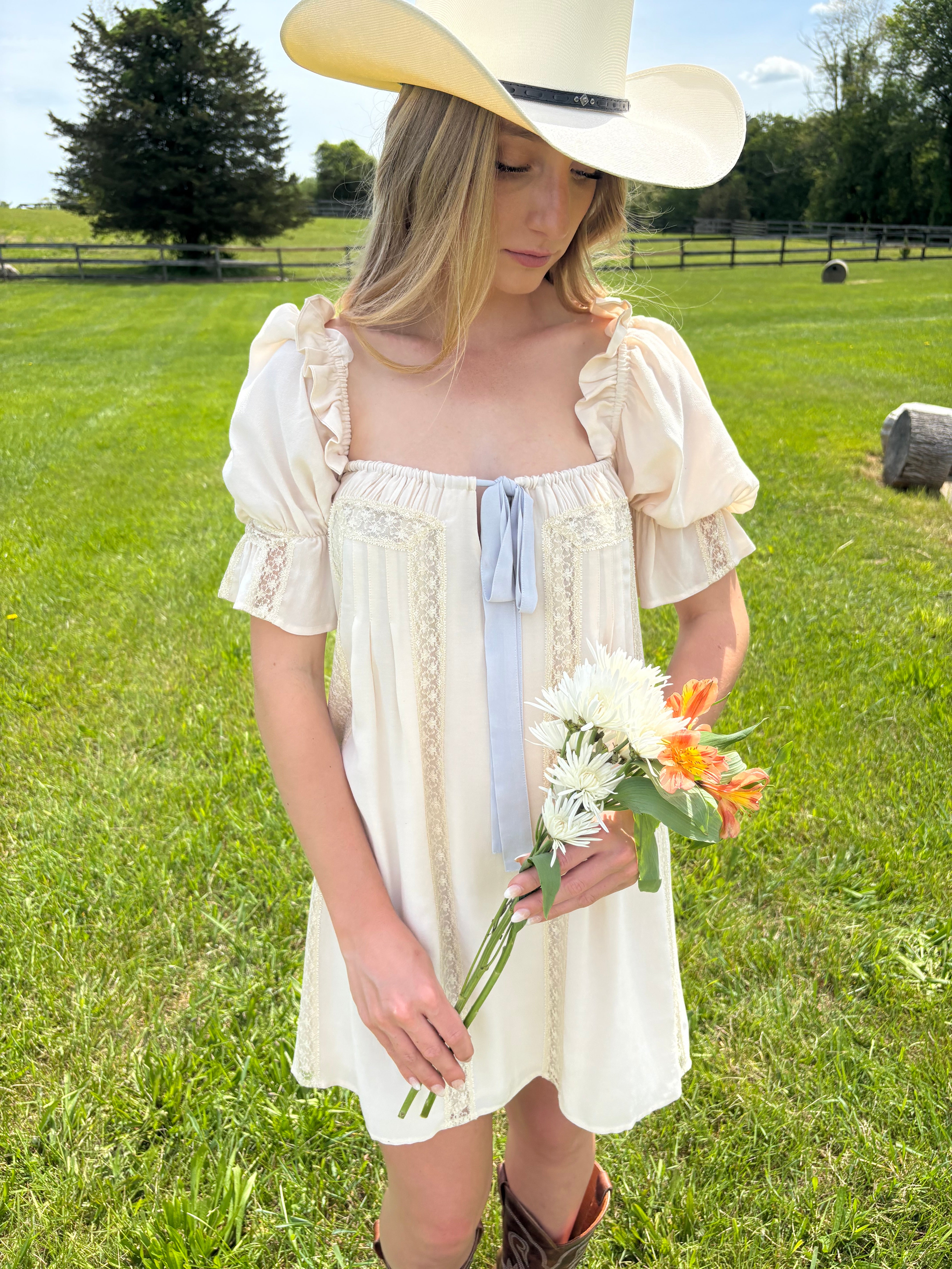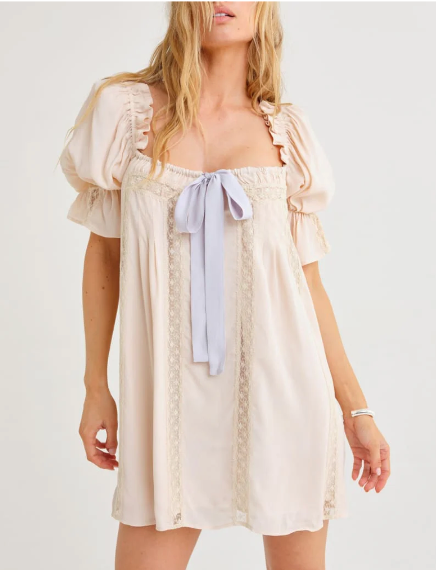 This heirloom mini dress is sure to turn heads with its fully lined design, contrast ties and keyhole neck, and delicate lace inserts. The ruffle detail and elegant pleating add a touch of charm, making it a must-have for any fashion-forward individual. Perfect for any occasion, from casual to formal.