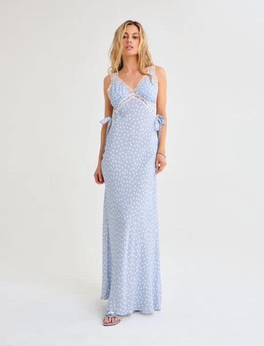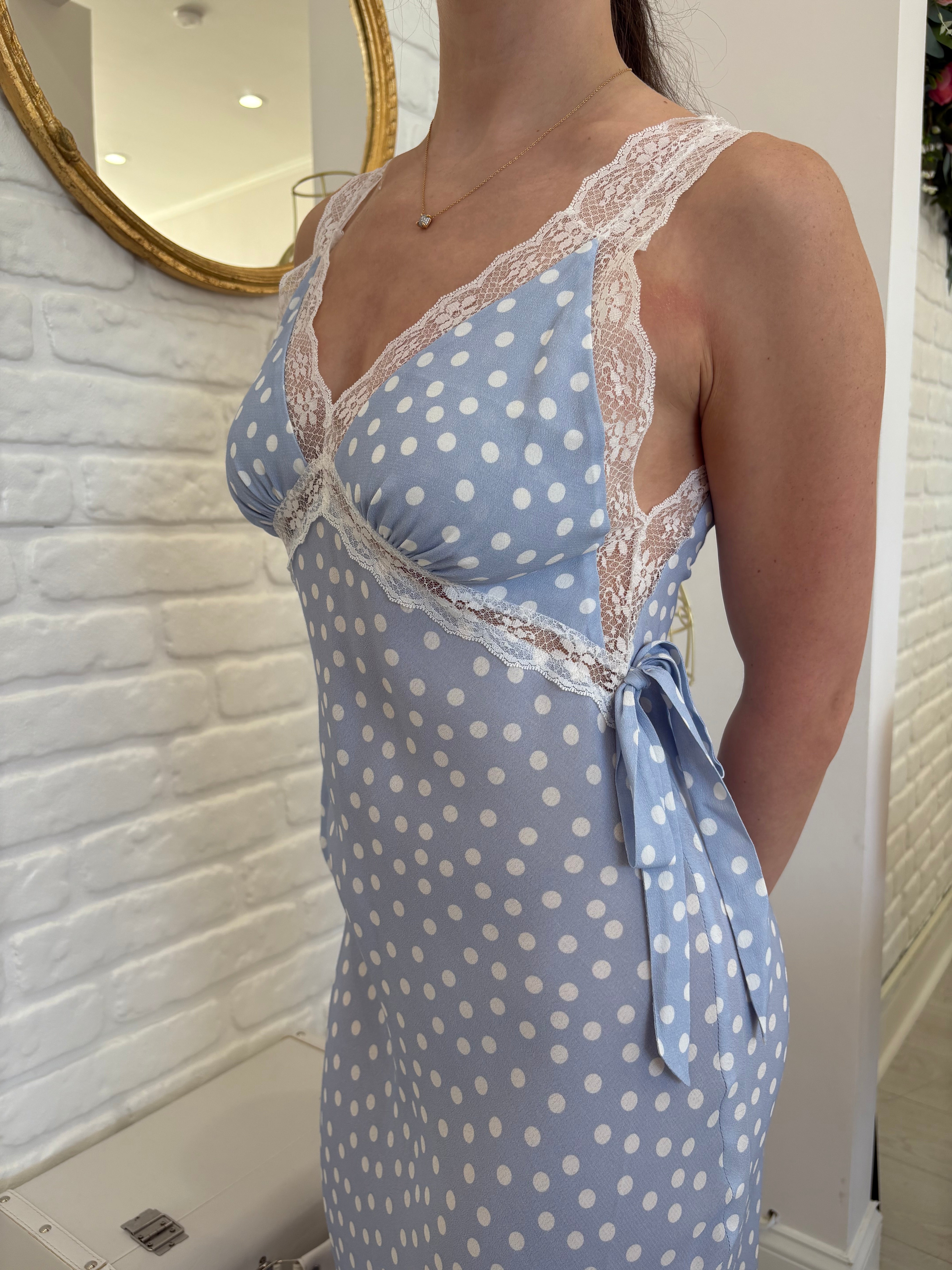 Unleash your inner fashionista with the Rumored Dolly Midi Dress! The bias cut ensures a flattering fit, while the lace trim adds a touch of elegance. With self bow ties at the side seams, this dress is both playful and chic. It's the perfect addition to your wardrobe!