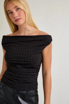 Rhinestones cascade across the fabric, catching light with every confident move you make. Whether you're ringing in the New Year or stealing the spotlight at holiday celebrations, this piece delivers the glamour and edge you need to command any room. The bare-shoulder silhouette is bold, the sparkle is undeniable, and the attitude is everything. This isn't just a top—it's your declaration that you're here to make an impression.