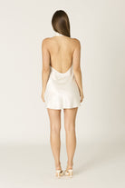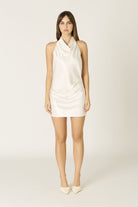 Effortless elegance meets modern sophistication in this satin mini dress. The draped halter neckline frames the shoulders beautifully while the open back creates a striking silhouette perfect for evening occasions. Slip-inspired construction offers a fluid, flattering fit that moves with you. Ideal for date nights, cocktail events, or any moment when you want to feel confident and chic.