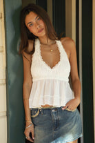The Claire Halter Babydoll Top combines delicate floral lace with lightweight chiffon for an effortlessly romantic look. The soft lace bodice features subtle stretch for all-day comfort, while the elastic band under the bust creates a flattering defined shape. A scalloped lace V-neckline with picot trim detailing adds feminine charm, and the sheer chiffon hem flows beautifully with every movement. The open back design with halter neck tie closure offers a modern twist on classic elegance. Perfect for date nights, summer outings, and vacation getaways—this babydoll top brings sophistication and ease to any warm-weather wardrobe.