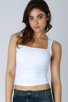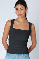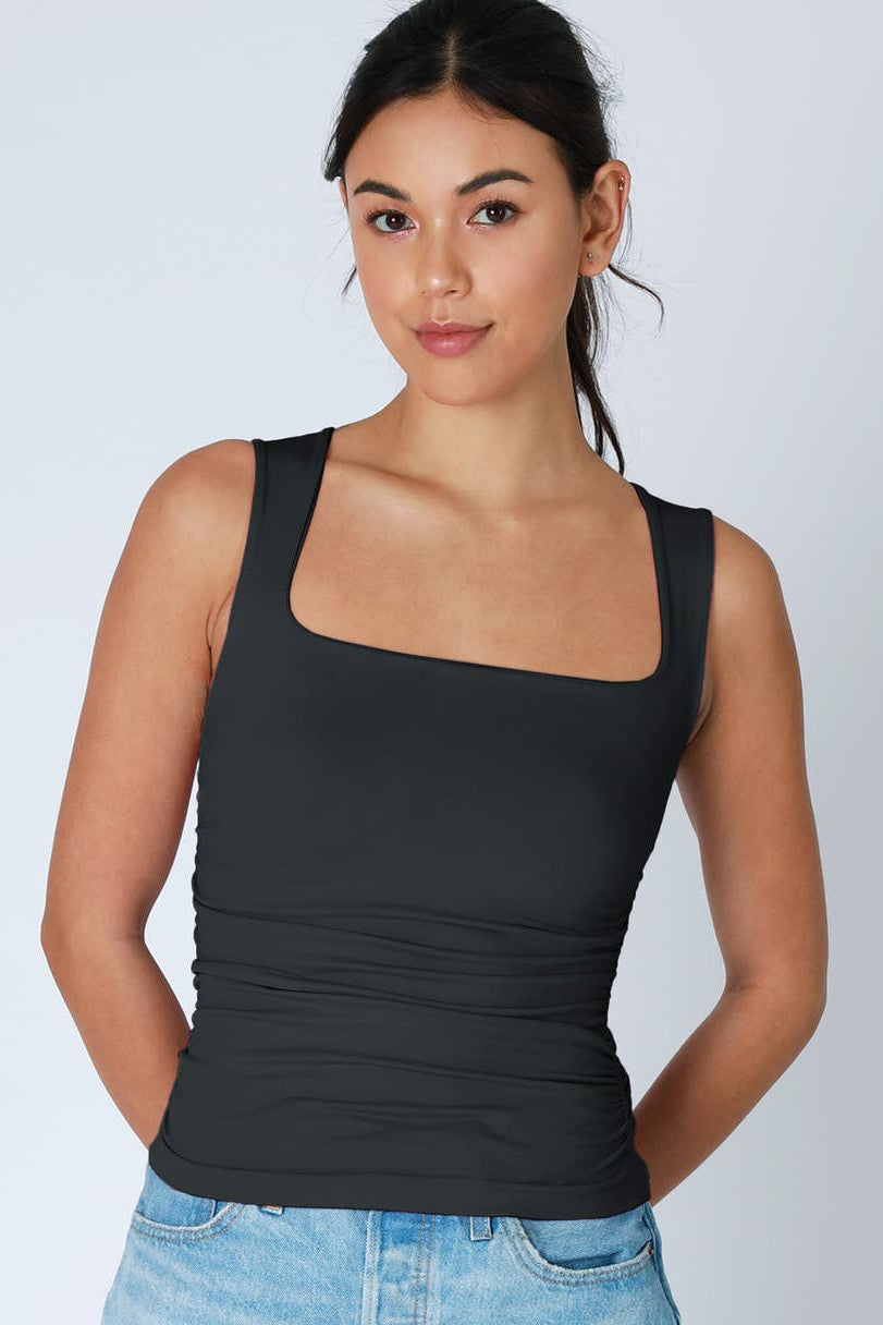 A timeless tank top elevated with elegant shirred detailing. The clean square neckline offers a flattering, modern silhouette perfect for layering or wearing solo. Crafted from a premium nylon-spandex blend, this versatile piece moves with you while maintaining its shape.