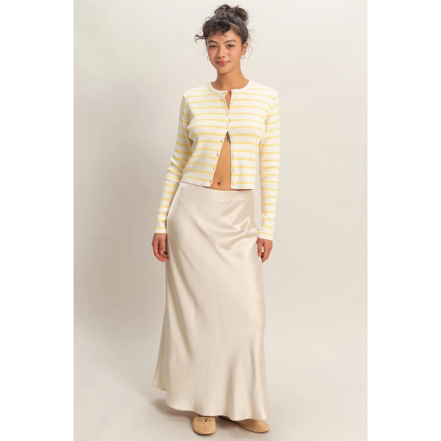 Elevate your wardrobe with this luxurious satin maxi skirt. The flowing length and fluid movement make it perfect for both special occasions and refined everyday wear. Pair it with a fitted top for a polished look, or dress it down with a casual blouse. A timeless piece that transitions seamlessly from day to night.
