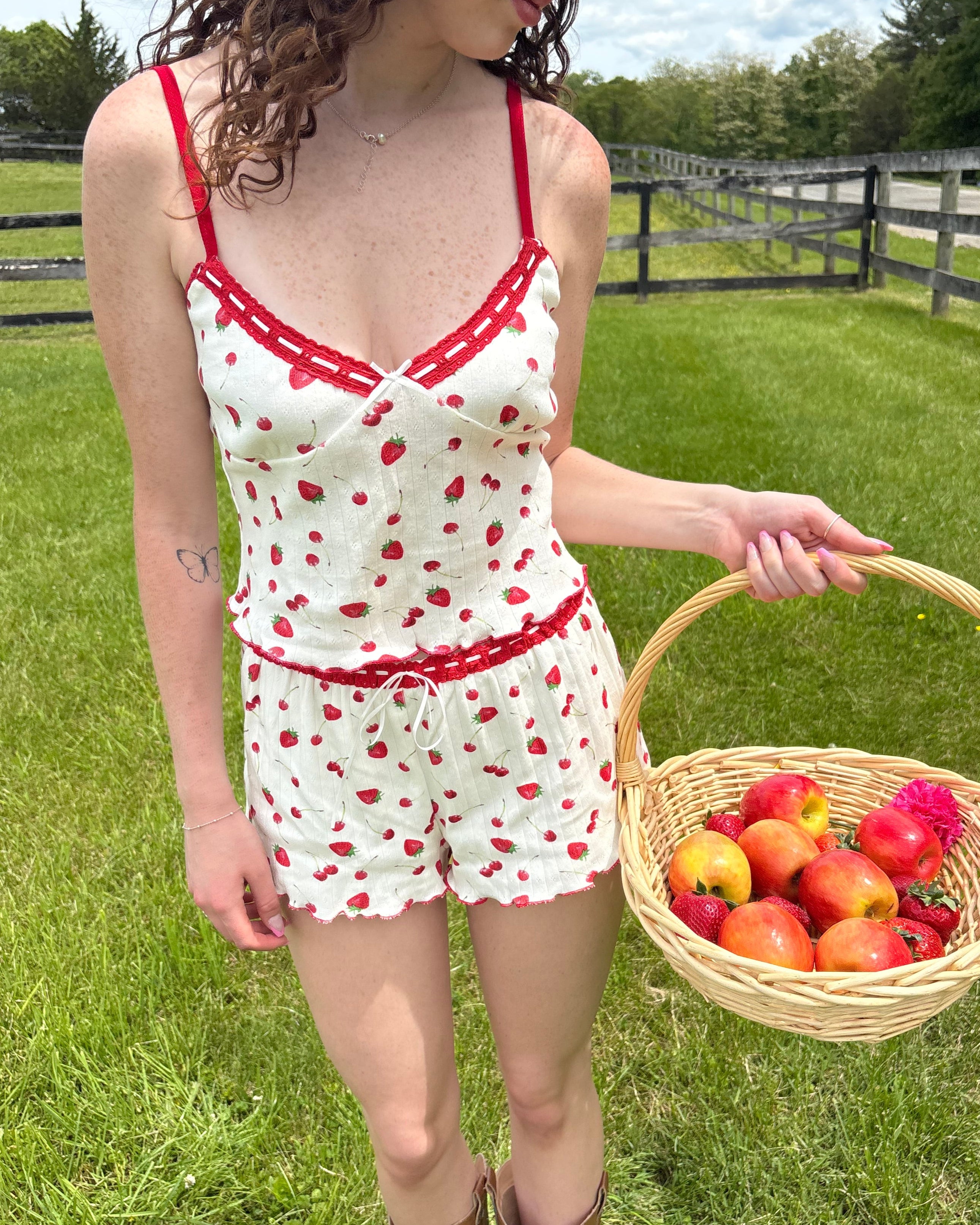 Dream up delicious nights in our Fruit Salad Bottoms! This playful pajama short features an adorable cherry and strawberry print that's ripe for bedtime fun. Soft, comfy, and just the right amount of sweet—it's the perfect recipe for beauty sleep with a side of fruity fashion. Pair with matching top for a dreamy ensemble that's berry hard to resist!