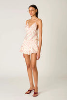The Hyperion Skirt brings fun and flirtation to your everyday rotation. This mini features a flattering mid-rise waistband with subtle ruching that skims your silhouette, paired with a fitted waist and upper hip for a polished look. The playful allover polka dot print adds vintage charm, while the gently flared hem keeps things breezy and modern. A convenient side zipper makes getting dressed effortless, and the full lining ensures comfort all day long.