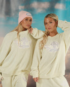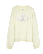 This playful pastel yellow crewneck brings a cozy vibe with a fun twist. Featuring a large embroidered cherub on the front, its light pink and white reflective threads shimmer subtly as you move. Perfect for adding a touch of charm and brightness to any outfit while keeping comfortable all day long.