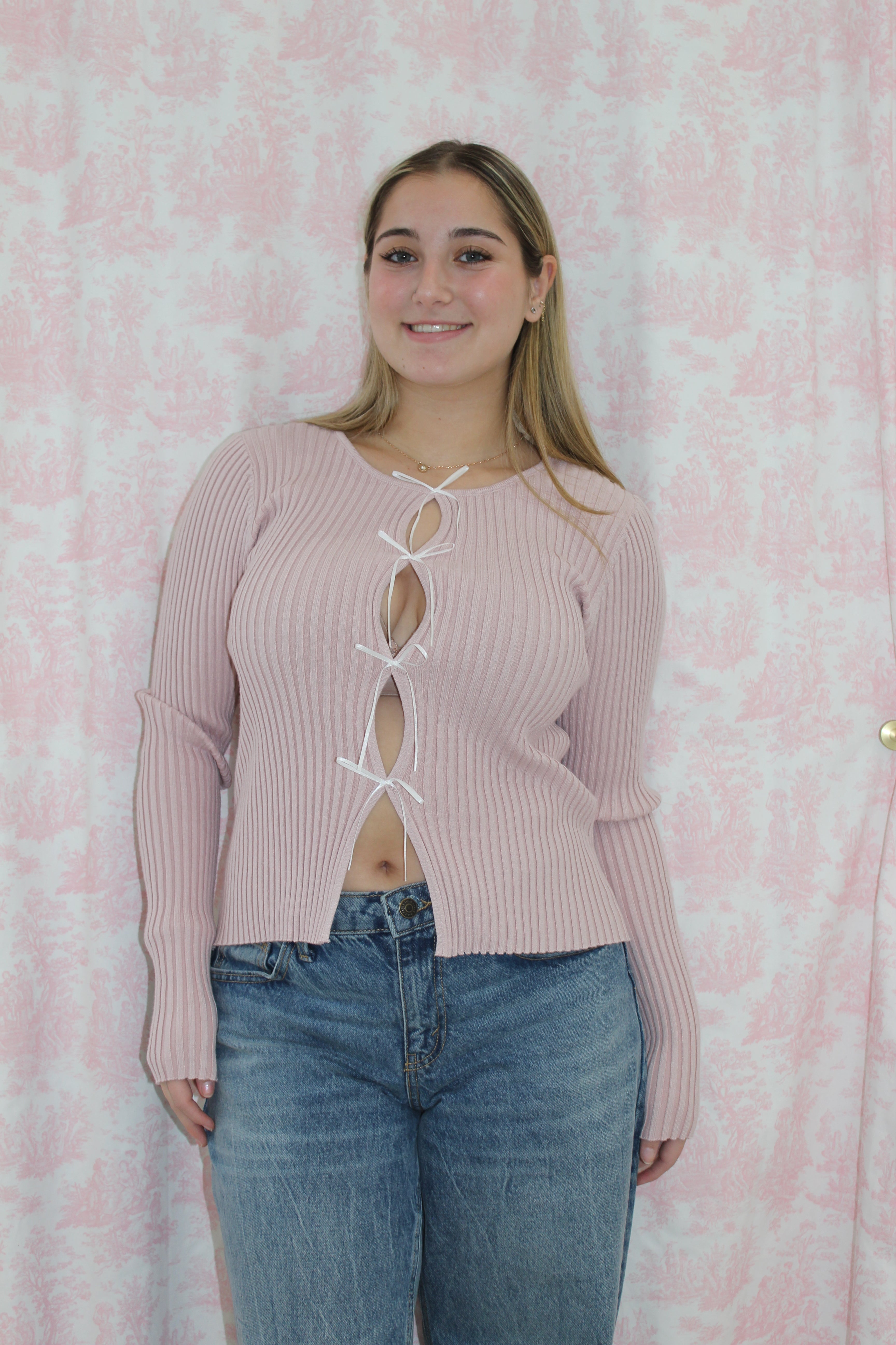 Get ready to blush in style with our "All About that Blush Top"! This rib knit top features playful openings in the front that meet with charming white bows. Perfect for adding a touch of whimsy to any outfit. Bring on the compliments!