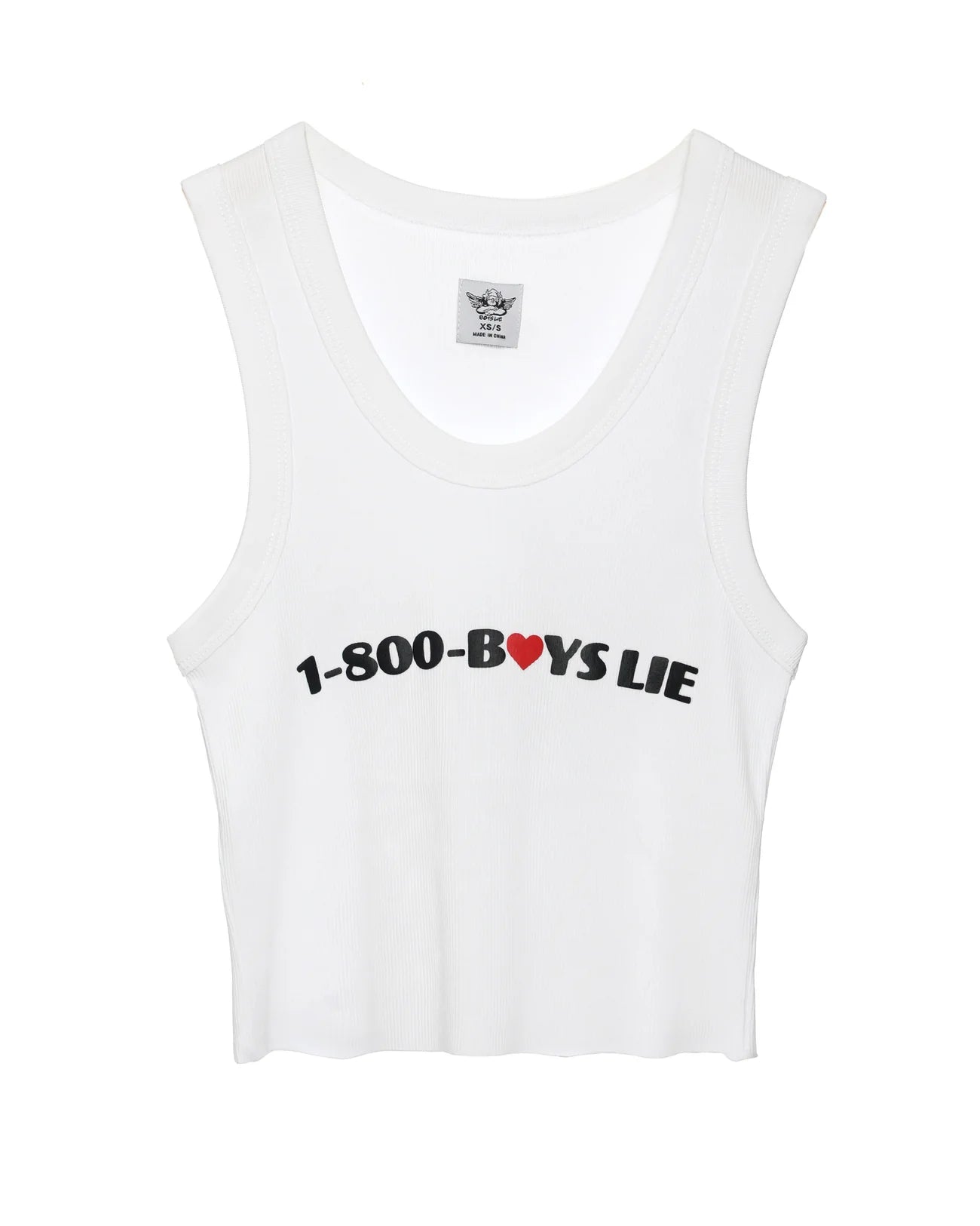 Get ready to turn heads with the Boys Lie 1-800 Heart Randy Tank. This white ribbed tank features a cheeky "1-800-BOYS LIE" graphic, adding an edgy flair to any outfit. The fitted design flatters your figure, while the soft ribbed fabric keeps you comfortable all day long. Now that's a lie we can get behind!