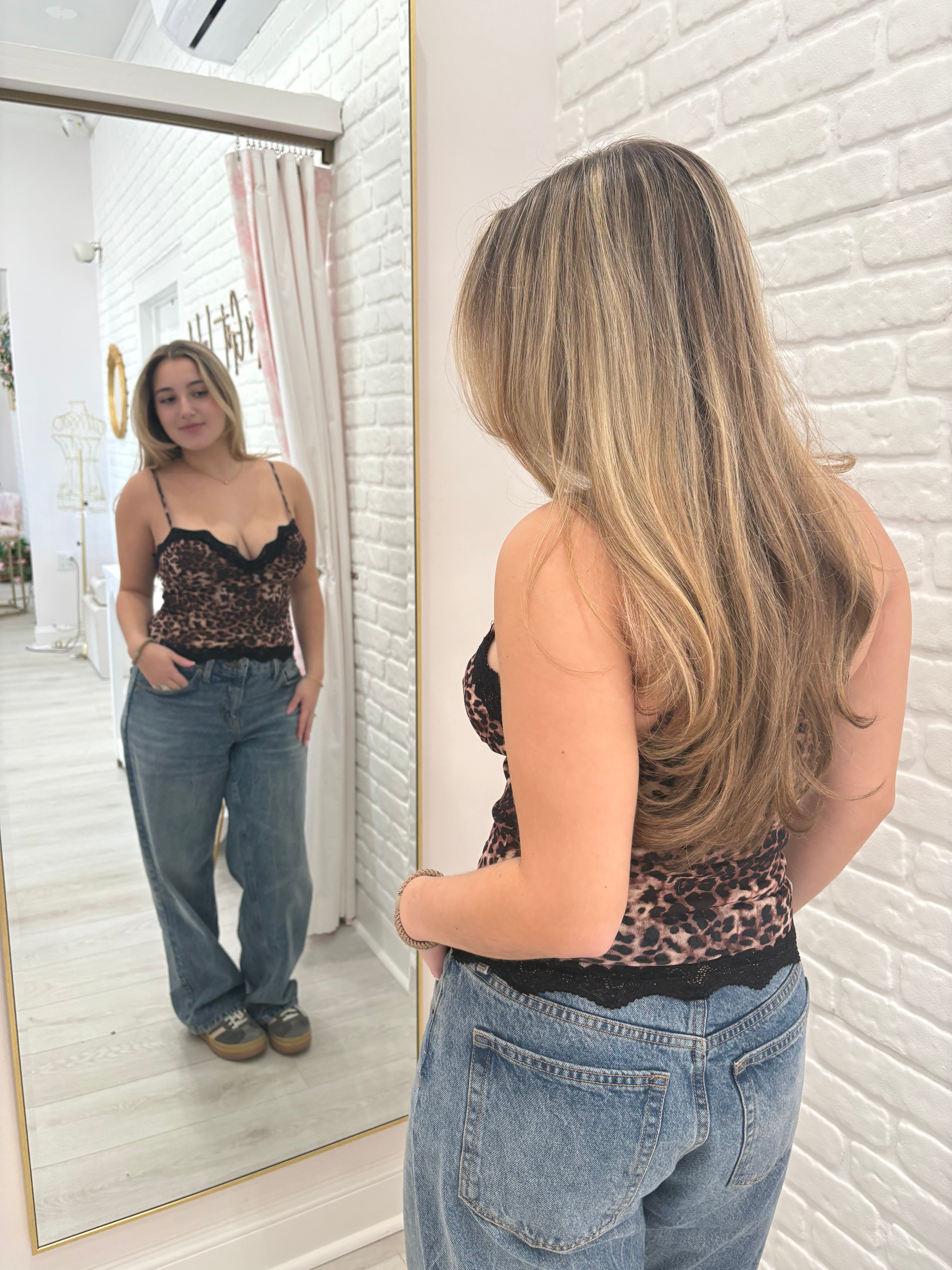 Get wild in the Panther Cami Top! This bustier style tank top features a playful leopard print, delicate lace hem, and a sweet bow on the bust. Perfect for adding some fierce fun to any outfit. Can be wore casually or going out!