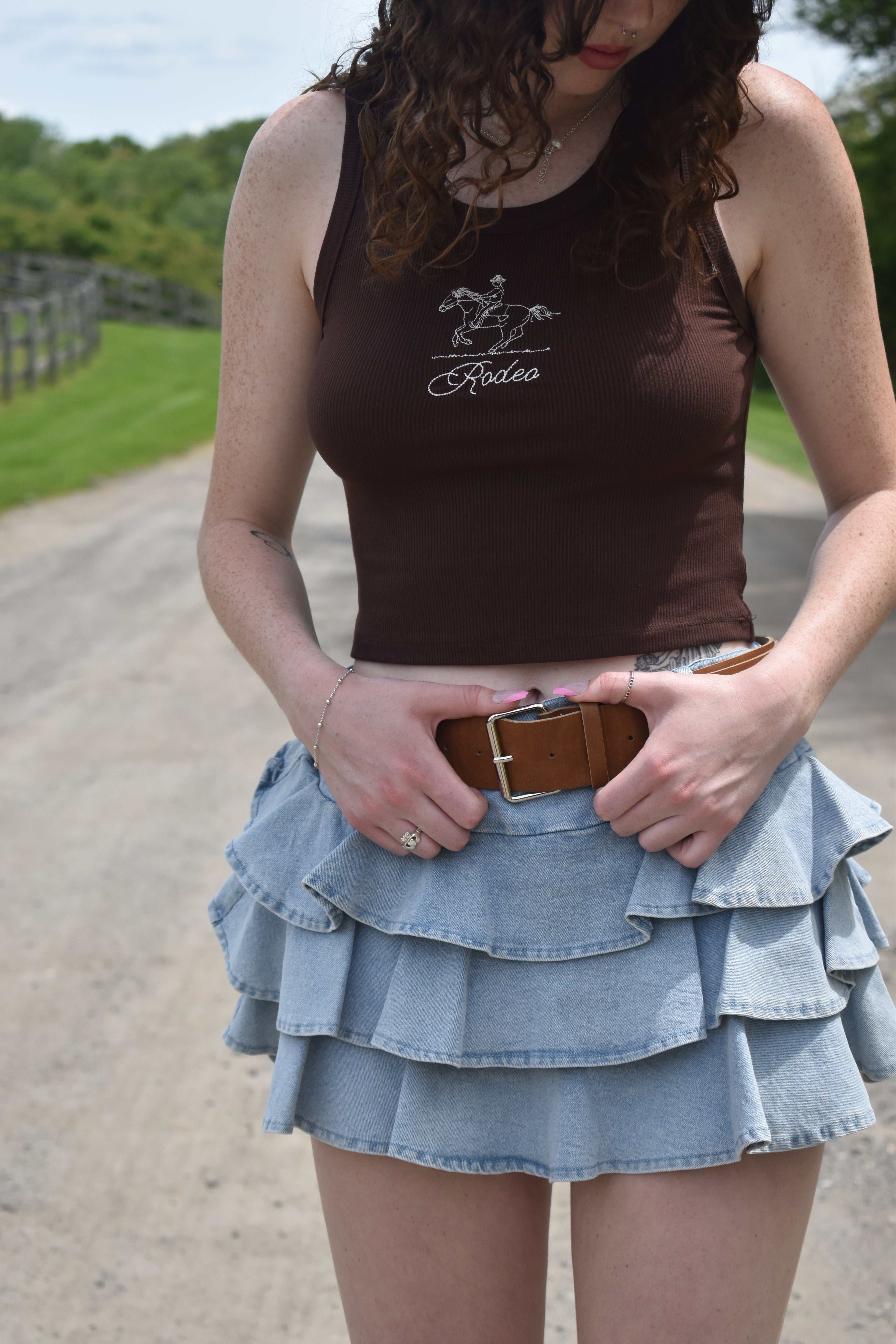 Saddle up your style with our Rodeo Tank Top! This playful brown scoop neck is crafted from ultra-soft material that keeps you comfy from sunrise to sunset. The eye-catching embroidered cowboy design adds just the right amount of Western flair to your casual wardrobe. Perfect for summer adventures or layering year-round!