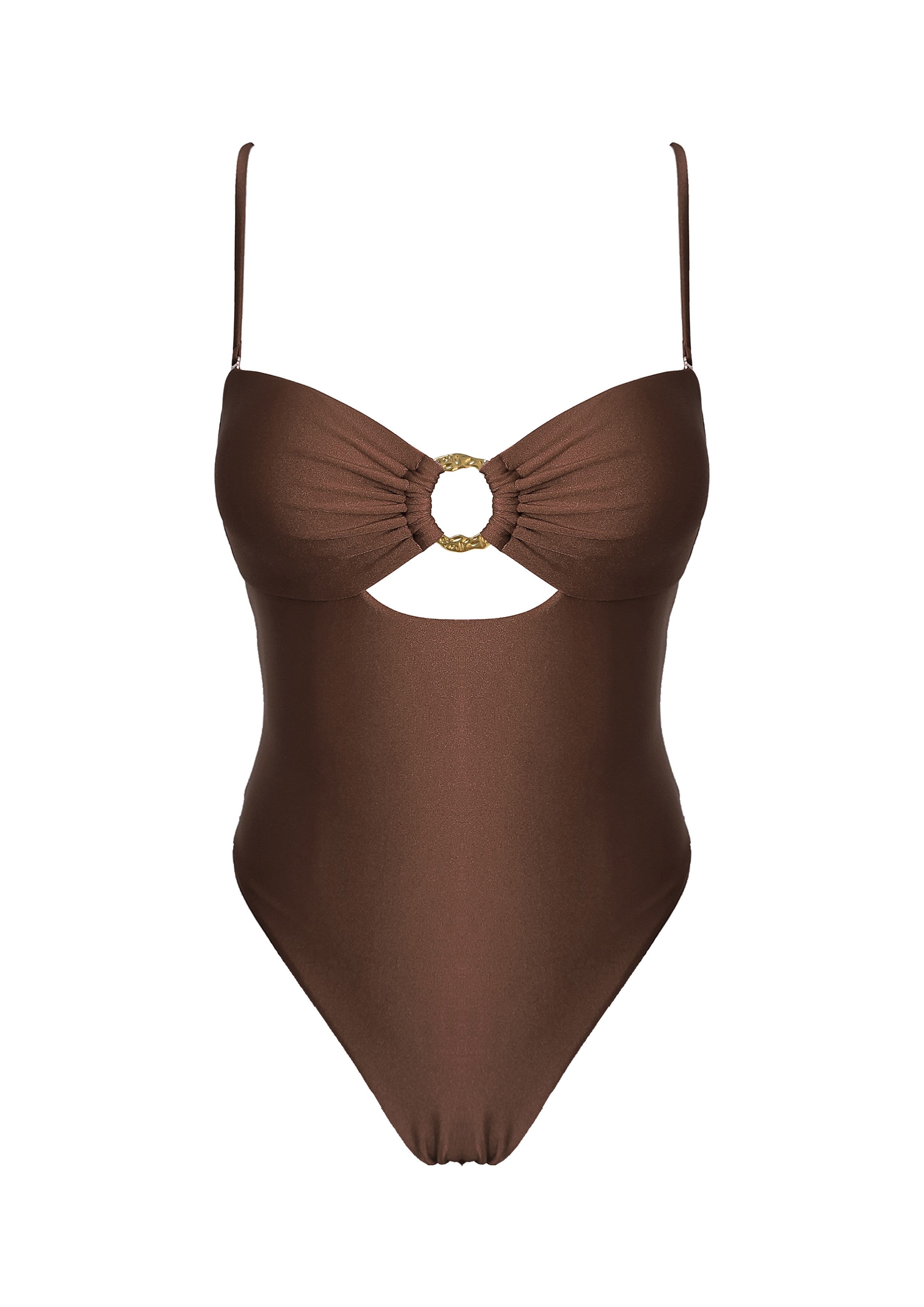 Jump into the pool in style with our Coffee One Piece Swimsuit! Designed with cut outs and a gold metal detail, this swimsuit is both trendy and functional. Perfect for lounging by the pool or catching some waves. Dive in and make a statement!