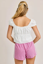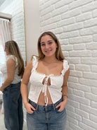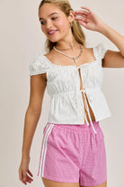 Add a playful touch to your wardrobe with the Elena Eyelet Blouse. Featuring cap sleeves and a square neck, this blouse also includes a charming front tie with eyelet details. Perfect for adding a quirky twist to any outfit!