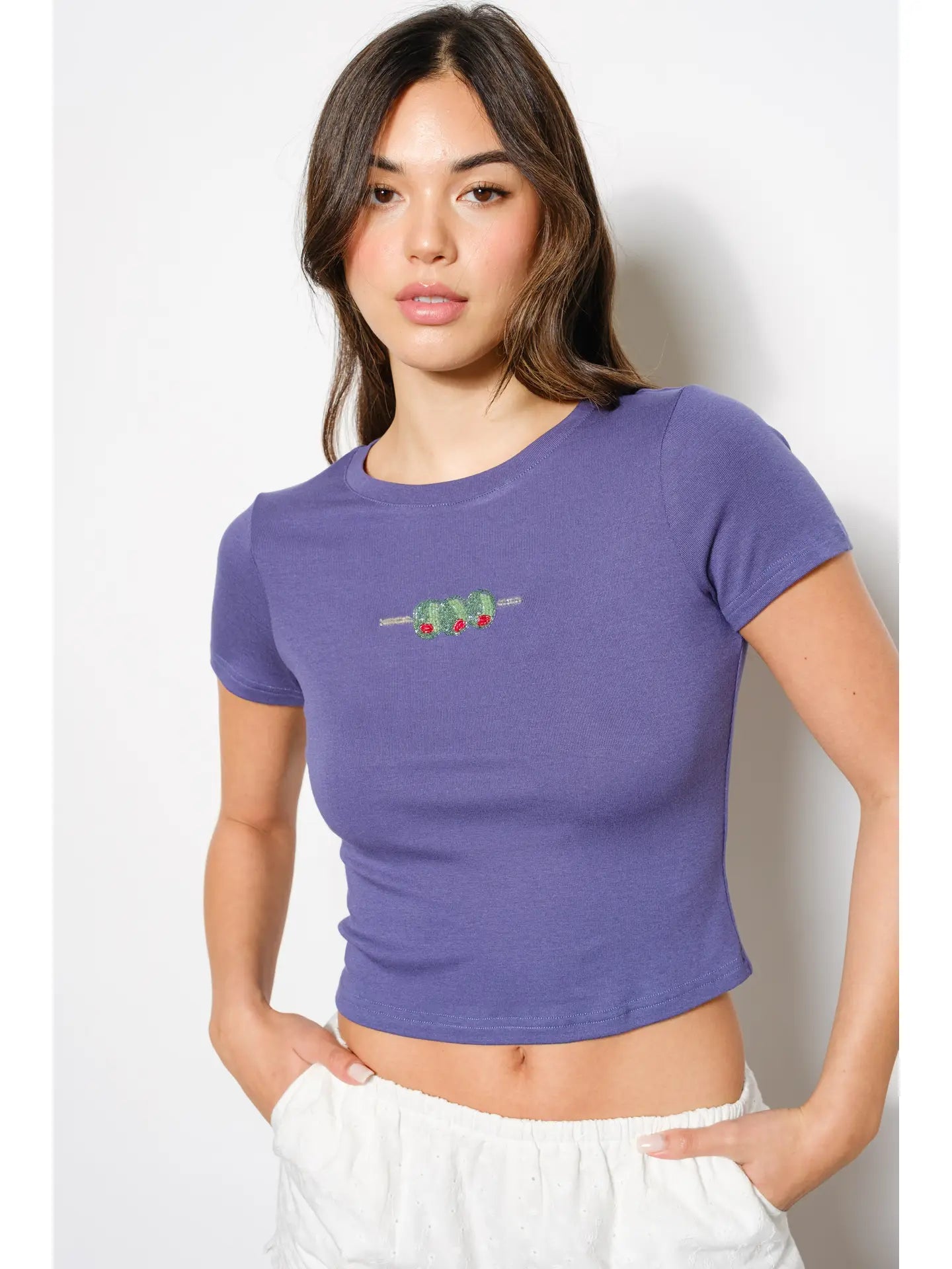 The Martini Tee is a playful take on casual wear, featuring delicate beadwork of olives. This fun design adds a quirky, spirited touch to your outfit, making it perfect for those who enjoy a little whimsy in their style. Comfortable and unique, it’s sure to become a favorite for relaxed, joyful days.