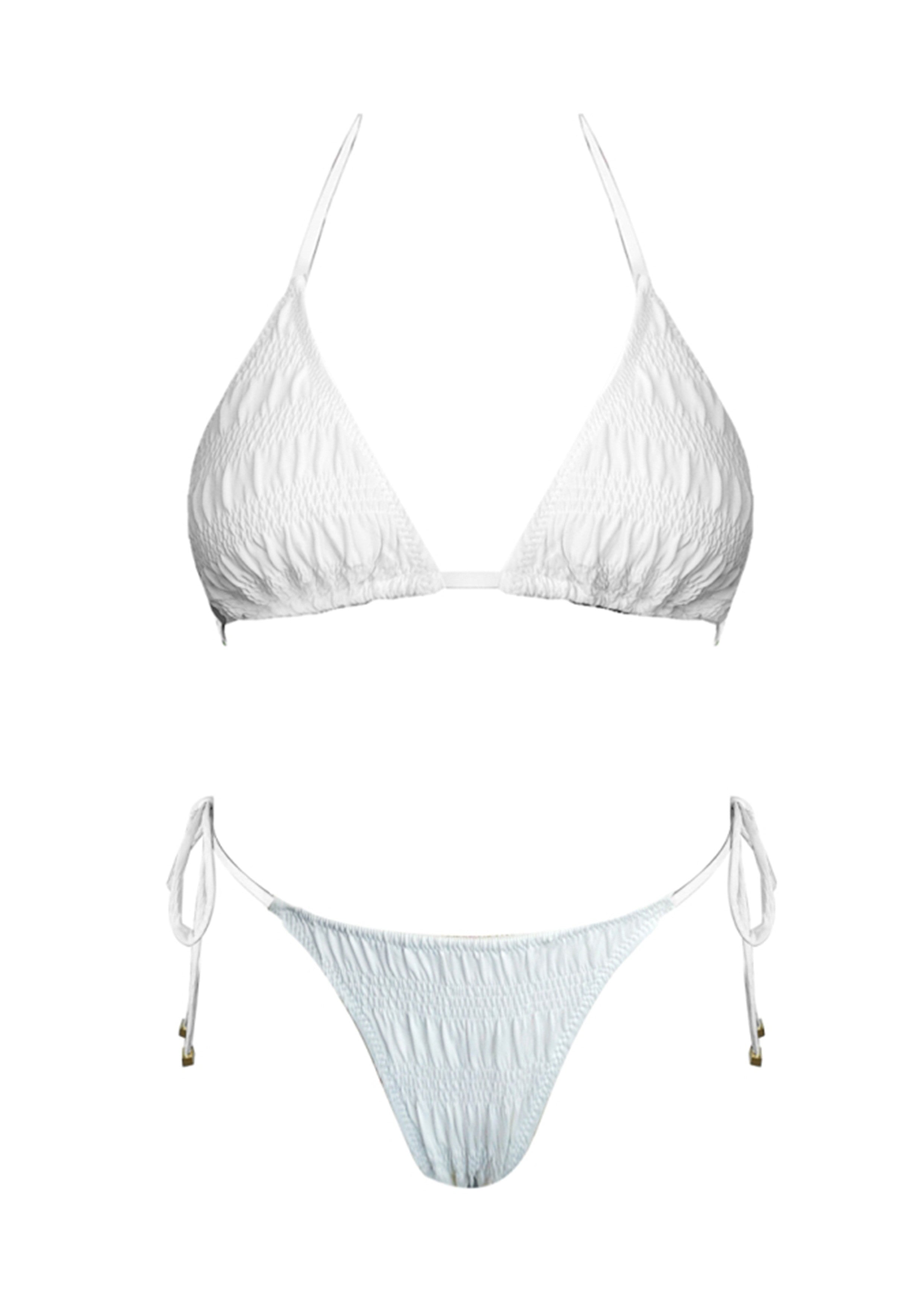 Make a splash with the Medusa Bikini Top! This white bikini top features a playful tie detail with golden beads, adding a touch of luxury to your poolside look. Don't be afraid to turn heads with this unique and stylish piece.