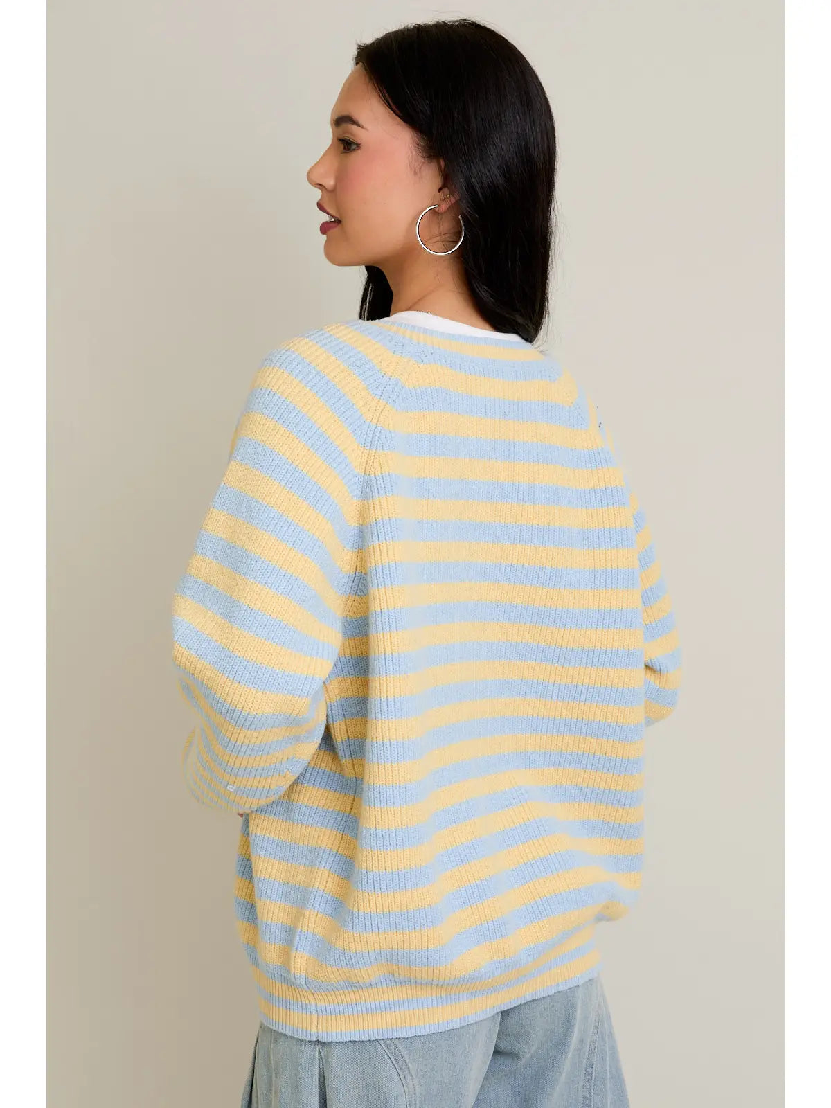 Brighten your day with the Yellow and Blue Candy Stripe Cardigan! This playful sweater features cheerful stripes that add a burst of color to any outfit. Perfect for layering, it brings a fun and cozy vibe to your wardrobe, making chilly days feel a little sunnier.